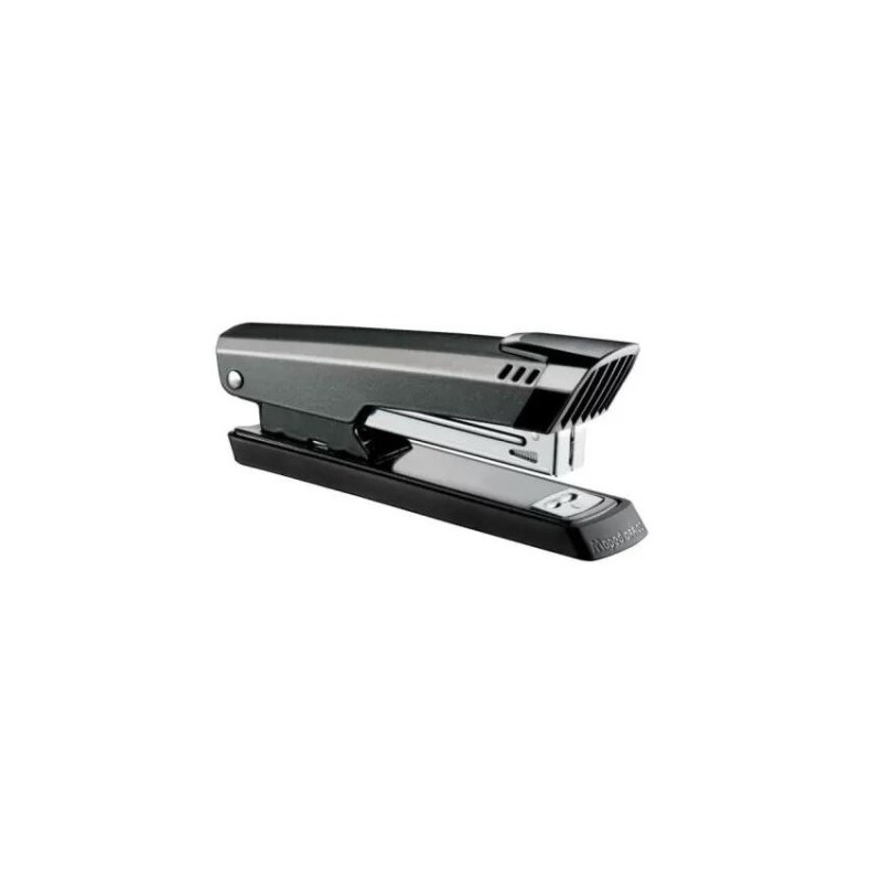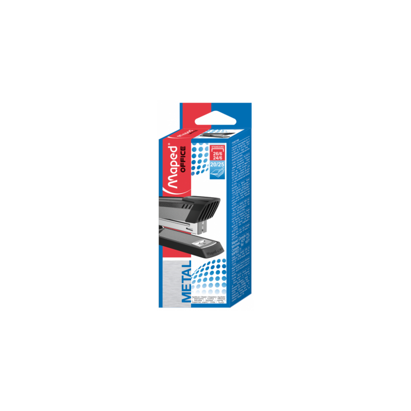 Agrafeuse Maped First Métal - 2 fonctions: agrafage, cloutage, épinglage - Ouverture à 180° - Profondeur agrafage: 56 mm - Agrafes adéquates: 24/6 et 26/6 - Capacité d'agrafage: 20 feuilles avec 24/6 et 25 feuilles avec 26/6 - Chargement d'agrafes par le haut - Mécanisme et tirette en métal - Partie inférieure antidérapante