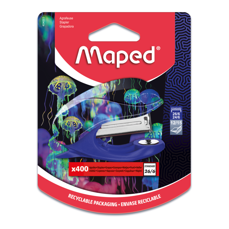 Ce blister contient une mini-agrafeuse de la collection Deepsea Paradise et une boîte de 400 agrafes 26/6. Les motifs sous-marins captivent les adolescents et les plongent dans un univers hypnotique !