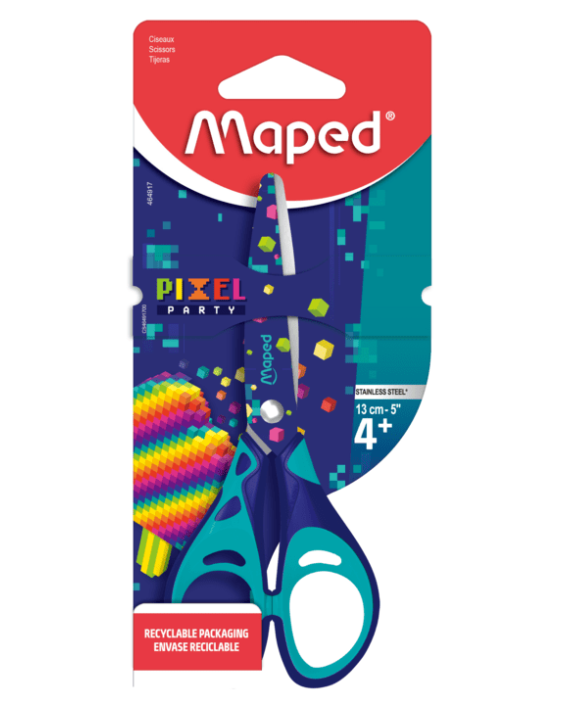 Ciseaux scolaires Pixel Party, 13 cm, bouts ronds, avec anneaux ergonomiques bi-matière pour un confort optimal et lames inox pour une coupe précise et durable. Design coloré inspiré du rétro gaming.