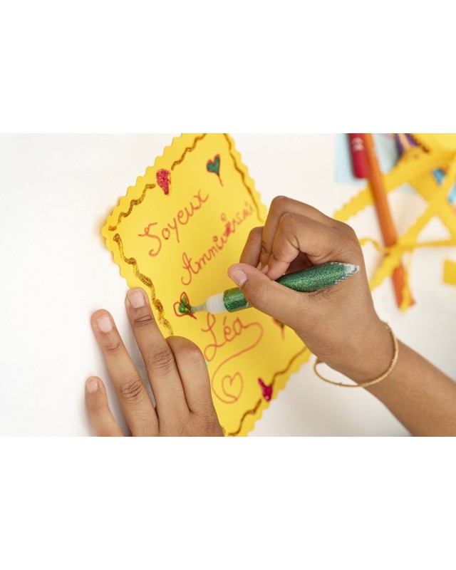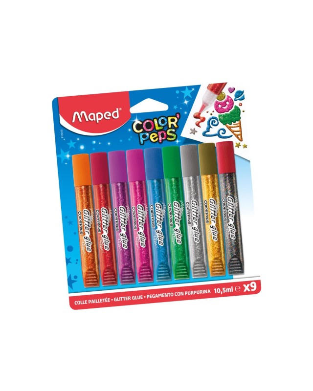 9 tubes de 10.5 ml de colle pailletée aux couleurs vives et variées pour des dessins éclatants !