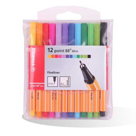 Le feutre fin STABILO point 88 Mini dans un pack de 12 couleurs d'écriture individuelles. Vous pouvez trouver une liste des noms de couleurs et des numéros de couleurs sous Propriétés.