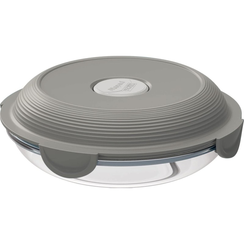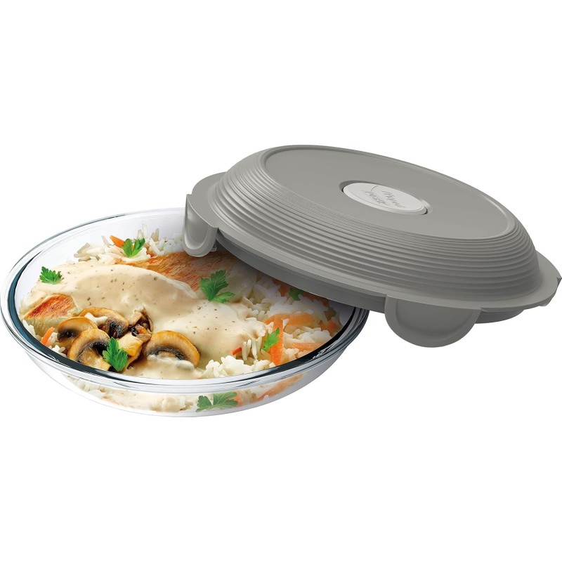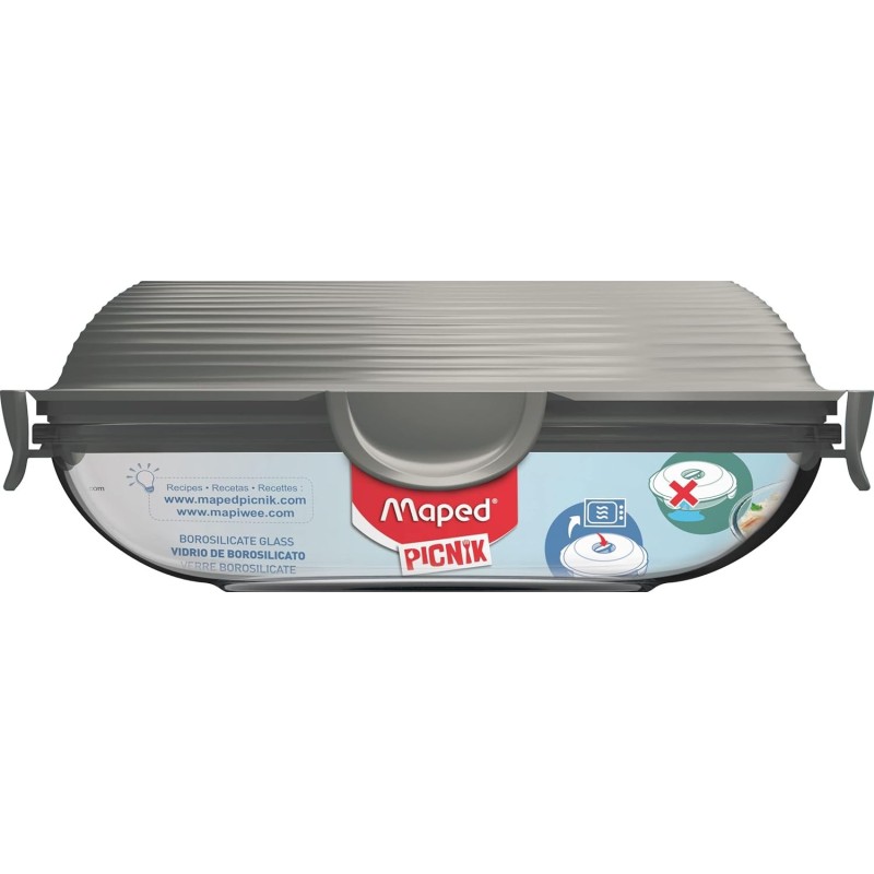 Lunch box en verre durable de 700 ml avec couvercle en plastique sans BPA, étanche et doté d’une valve pour chauffer au micro-ondes. Résiste aux rayures, taches et odeurs, compatible lave-vaisselle et four traditionnel (sans couvercle).