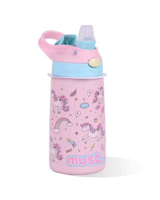 Le bracelet de la société Must est fabriqué dans un matériau en acier inoxydable qui ne se casse pas et ne rouille pas avec le temps. De part sa matière, il n'est pas affecté par les boissons acides comme les jus de fruits contrairement à l'aluminium. De plus, il fait également chaud, ce qui a la propriété de maintenir la température du liquide constante pendant longtemps, comme par exemple l'été à la plage. Il dispose même d'une paille pour un débit facile et contrôlé lorsque l'enfant boit.